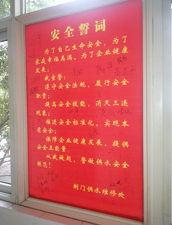 維修處維修工作點(diǎn)多面廣,施工環(huán)境日益復(fù)雜,安全生產(chǎn)形勢面臨嚴(yán)峻挑戰(zhàn)。抓好安全生產(chǎn)各項(xiàng)工作是維修處一直常抓不懈的一項(xiàng)重要工作,而探討不拘一格的安全生產(chǎn)管理模式和多渠道、多形式的全員安全教育培訓(xùn)方式也一直是維修處創(chuàng)新安全管理方式、適應(yīng)安全管理新常態(tài)的重要舉措。全員安全宣誓是我處今年安全生產(chǎn)月的一大亮點(diǎn),全體人員由處領(lǐng)導(dǎo)帶隊(duì)在宣誓墻下莊嚴(yán)宣誓:“為了自己生命安全,為了家庭幸福美滿,為了企業(yè)健康發(fā)展,我宣誓……從我做起,誓做供水安全模范!”