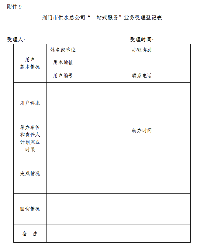 9.《荊門(mén)市供水總公司“一站式服務(wù)”業(yè)務(wù)受理登記表》