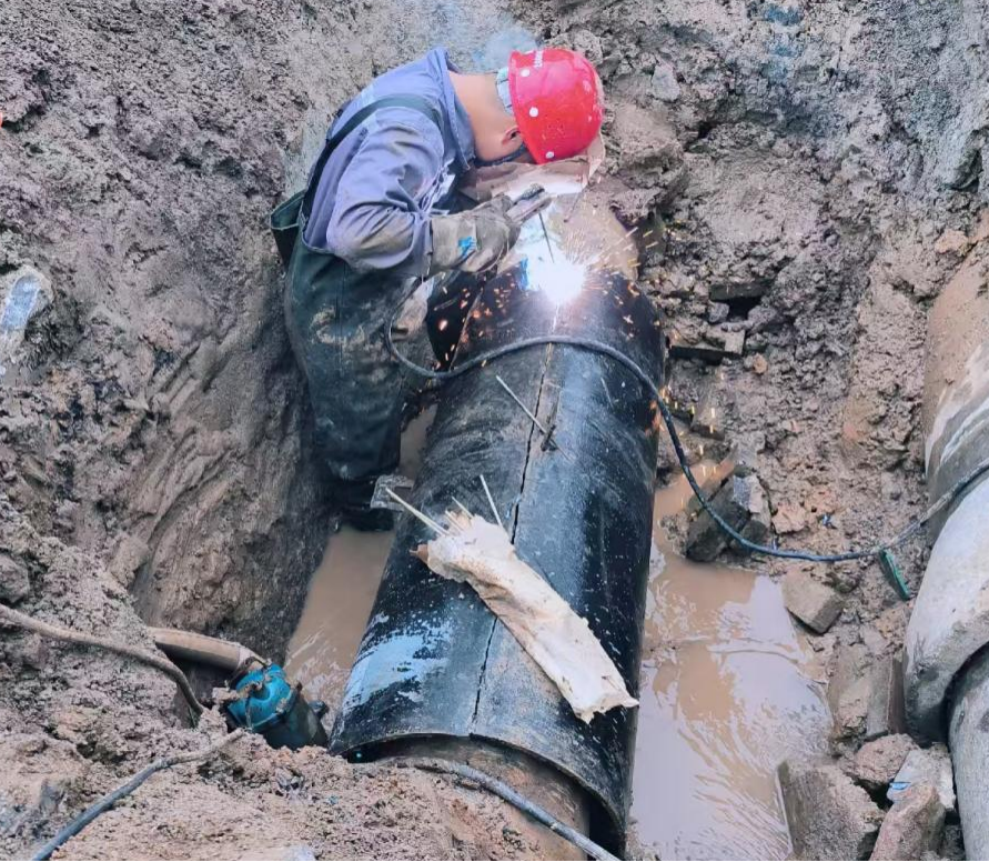 施工現(xiàn)場(chǎng)情況復(fù)雜,故障管道埋深達(dá)3米,搶修人員頂風(fēng)冒雨,克服重重困難,加速完成管道清理、融口焊接,歷經(jīng)4小時(shí)恢復(fù)正常供水。